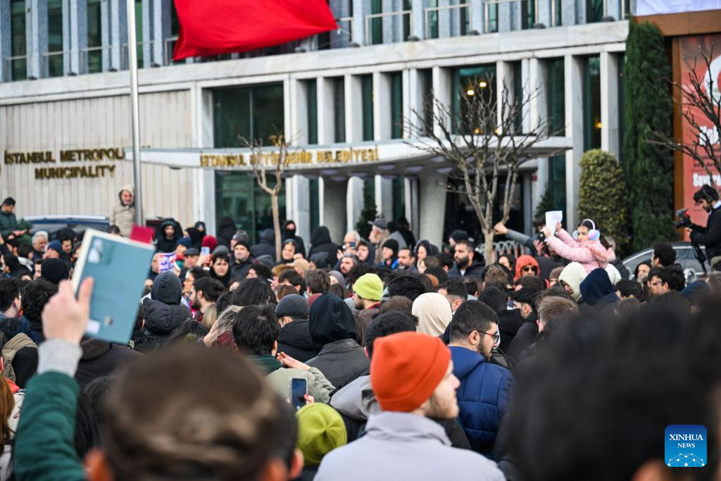 Supporters of Istanbul Mayor Ekrem Imamoglu gather outside the Istanbul Metropolitan Municipality building in Istanbul, Türkiye, March 19, 2025. Turkish authorities issued a detention order for Istanbul Mayor Ekrem Imamoglu on Wednesday and dispatched police forces to the mayor's residence, local media reported. (Xinhua/Liu Lei)
