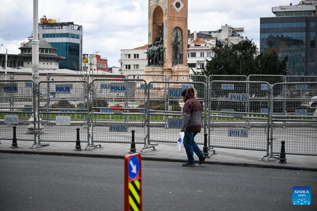 This photo taken on March 19, 2025 shows the blocked Taksim Square in Istanbul, Türkiye. Turkish authorities issued a detention order for Istanbul Mayor Ekrem Imamoglu on Wednesday and dispatched police forces to the mayor's residence, local media reported. (Xinhua/Liu Lei)