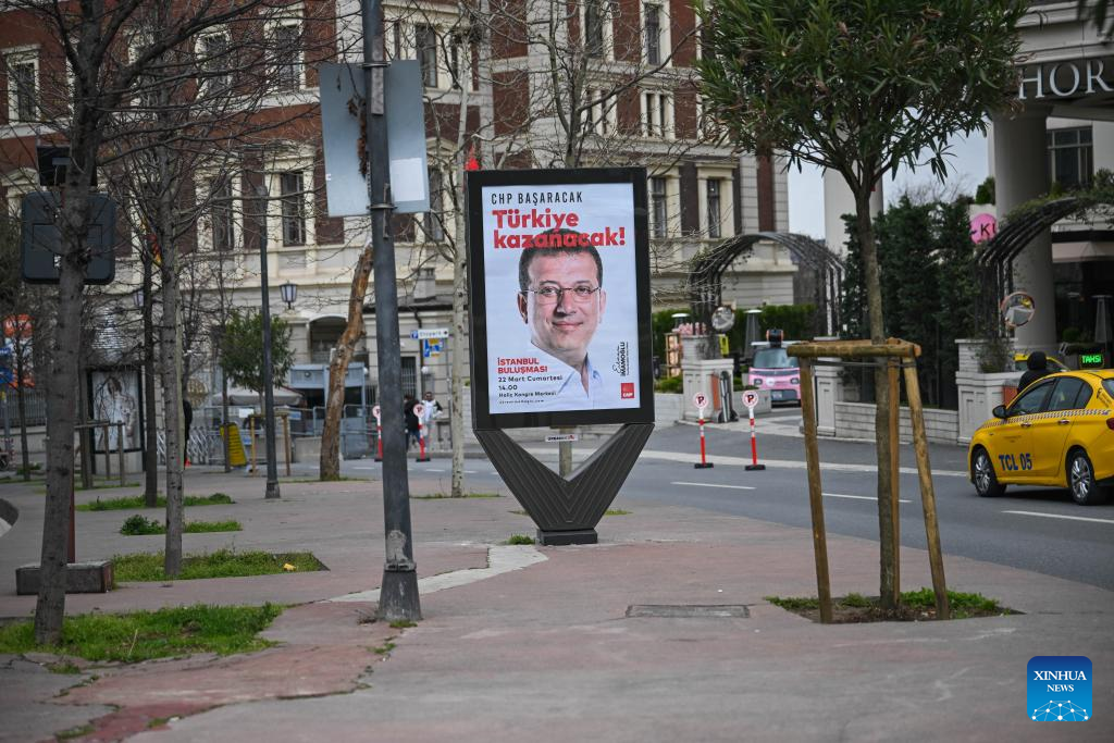 This photo taken on March 19, 2025 shows a poster of Istanbul Mayor Ekrem Imamoglu in Istanbul, Türkiye. Turkish authorities issued a detention order for Istanbul Mayor Ekrem Imamoglu on Wednesday and dispatched police forces to the mayor's residence, local media reported. (Xinhua/Liu Lei)