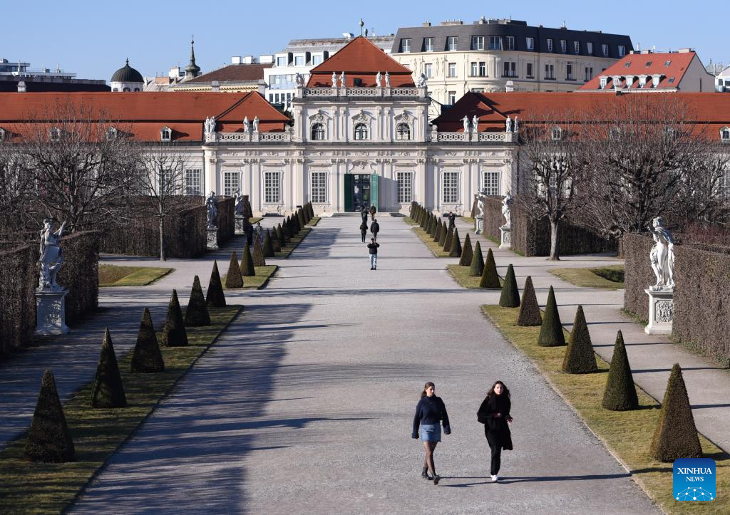 People visit the Belvedere Garden in Vienna, Austria, March 19, 2025. As the temperature here has been rising, people came to the Belvedere Garden to enjoy the sunny days. (Xinhua/He Canling)