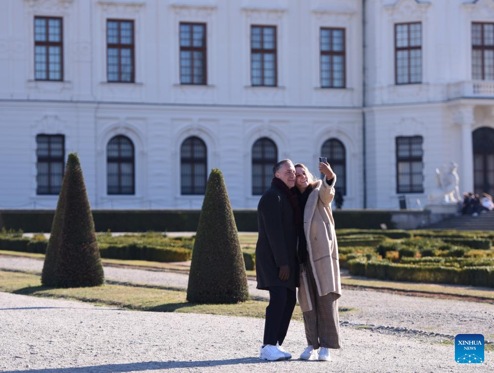 People take a selfie at the Belvedere Garden in Vienna, Austria, March 19, 2025. As the temperature here has been rising, people came to the Belvedere Garden to enjoy the sunny days. (Xinhua/He Canling)