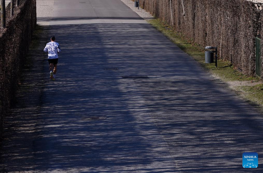A man runs at the Belvedere Garden in Vienna, Austria, March 19, 2025. As the temperature here has been rising, people came to the Belvedere Garden to enjoy the sunny days. (Xinhua/He Canling)