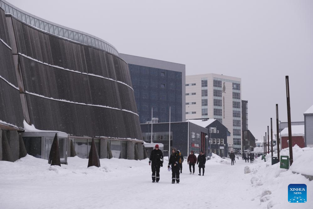 People walk in downtown Nuuk, capital of Greenland, an autonomous territory of Denmark, March 24, 2025. (Xinhua/Zhang Yuliang)
