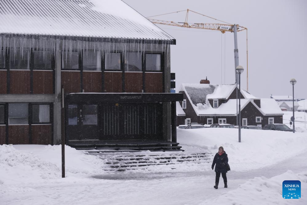A person walks by Greenland's parliament building in Nuuk, capital of Greenland, an autonomous territory of Denmark, March 24, 2025. (Xinhua/Zhang Yuliang)