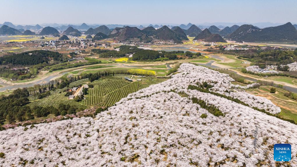 An aerial drone photo taken on March 26, 2025 shows cherry blossoms in Gui'an New Area, southwest China's Guizhou Province. (Xinhua/Tao Liang)