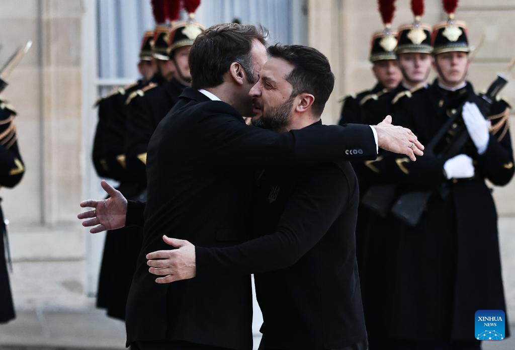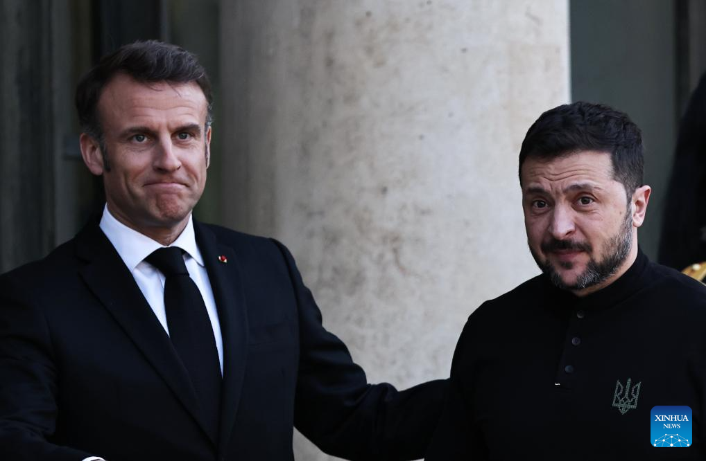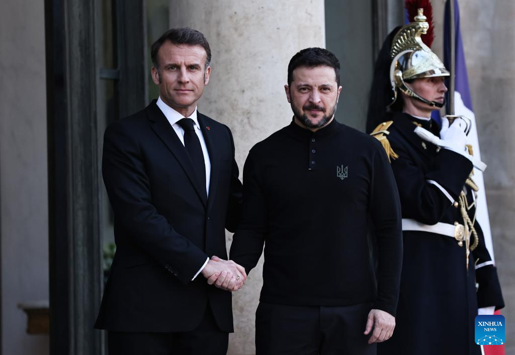 French President Emmanuel Macron (L) welcomes visiting Ukrainian President Volodymyr Zelensky at the Elysee Palace in Paris, France, on March 26, 2025. France will provide an additional 2 billion euros (2.2 billion U.S. dollars) in aid for Ukraine, President Emmanuel Macron announced on Wednesday. (Xinhua/Gao Jing)