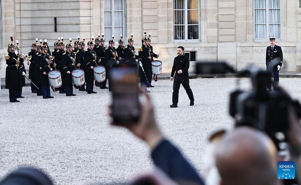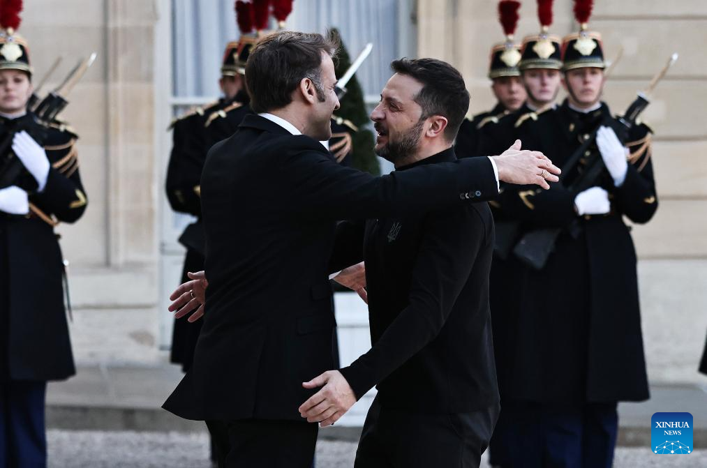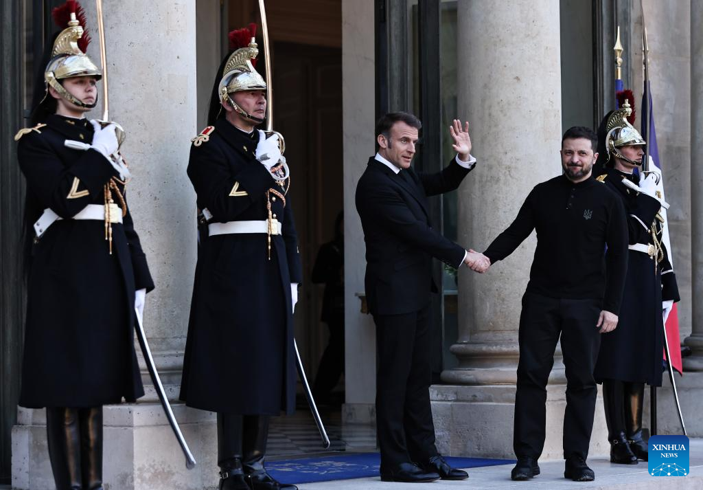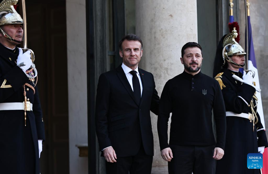 Ukrainian President Volodymyr Zelensky (C) arrives at the Elysee Palace in Paris, France, on March 26, 2025. France will provide an additional 2 billion euros (2.2 billion U.S. dollars) in aid for Ukraine, President Emmanuel Macron announced on Wednesday. (Xinhua/Gao Jing)