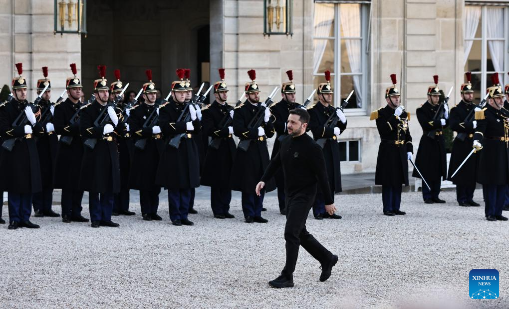 Ukrainian President Volodymyr Zelensky (Front) arrives at the Elysee Palace in Paris, France, on March 26, 2025. France will provide an additional 2 billion euros (2.2 billion U.S. dollars) in aid for Ukraine, President Emmanuel Macron announced on Wednesday. (Xinhua/Gao Jing)