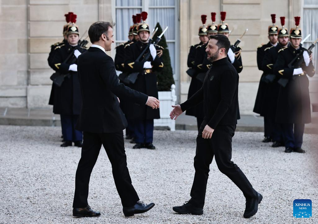 French President Emmanuel Macron (2nd L) welcomes visiting Ukrainian President Volodymyr Zelensky at the Elysee Palace in Paris, France, on March 26, 2025. France will provide an additional 2 billion euros (2.2 billion U.S. dollars) in aid for Ukraine, President Emmanuel Macron announced on Wednesday. (Xinhua/Gao Jing)