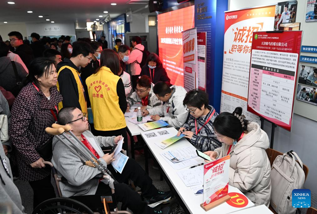 A job seeker with disabilities (L) talks with a recruiter during a job fair in north China's Tianjin, March 26, 2025. A job fair was held for people with disabilities who graduated from higher education in Tianjin on Wednesday, providing over 100 positions to job seekers. (Xinhua/Zhao Zishuo)