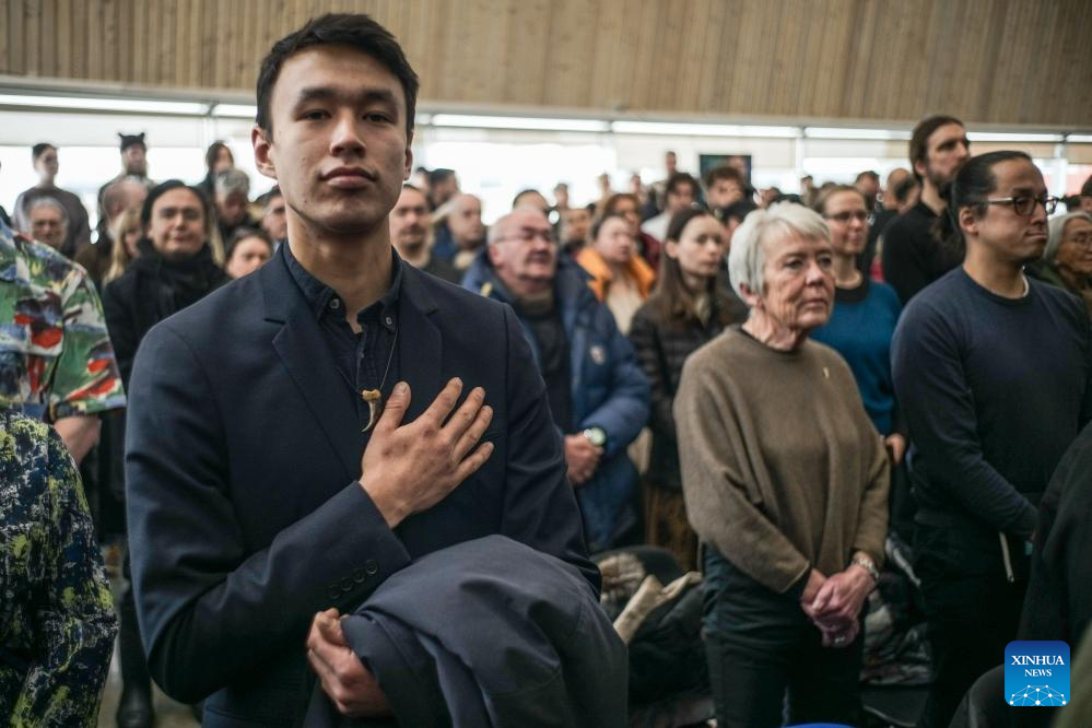 People attend a ceremony marking the establishment of a new autonomous government of Greenland, in Nuuk, capital of Greenland, an autonomous territory of Denmark, March 28, 2025. Four Greenlandic parties signed a new coalition agreement on Friday in Nuuk, capital of Greenland, to establish a new autonomous government. The chairman of the Demokraatit (Democratic Party), Jens-Frederik Nielsen, will be the prime minister of the government. (Xinhua/Peng Ziyang)