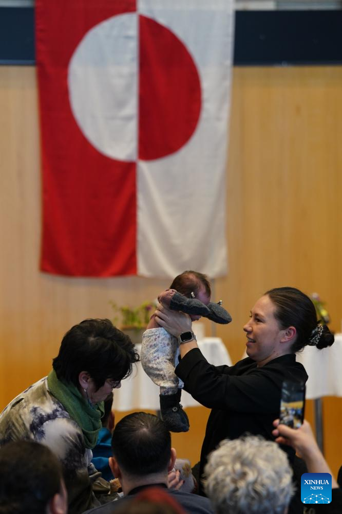 A baby is lifted up during the ceremony marking the establishment of a new autonomous government of Greenland, in Nuuk, capital of Greenland, an autonomous territory of Denmark, March 28, 2025. Four Greenlandic parties signed a new coalition agreement on Friday in Nuuk, capital of Greenland, to establish a new autonomous government. The chairman of the Demokraatit (Democratic Party), Jens-Frederik Nielsen, will be the prime minister of the government. (Xinhua/Peng Ziyang)