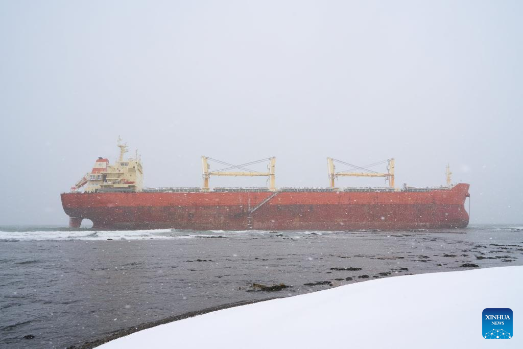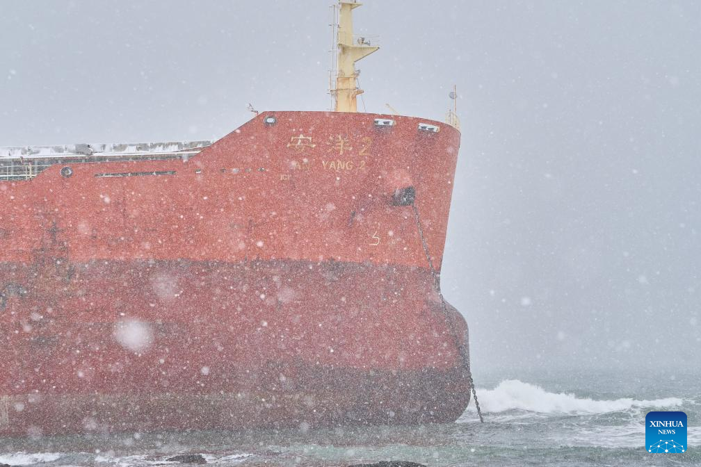 This photo taken on March 30, 2025 shows the grounded Chinese cargo ship Anyang-2 near Nevelsk, Russia. Chinese and Russian authorities are actively advancing rescue efforts for the Chinese cargo ship Anyang-2, which ran aground near Nevelsk, on Russia's Sakhalin Island, the Chinese Consulate General in Vladivostok said on Sunday. The Chinese cargo ship "Anyang-2" ran aground near the Port of Nevelsk on Sakhalin Island in the early hours of Feb. 9 following a severe storm. The vessel was carrying approximately 50 tons of diesel and 700 tons of heavy fuel oil. No pollution has been detected in the surrounding waters following the incident, according to Sakhalin's governor. (Photo by Guo Feizhou/Xinhua)
