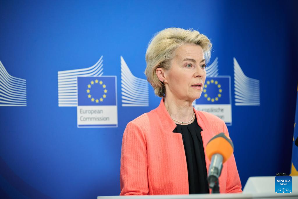In a statement responding to the U.S. move, von der Leyen said that U.S. President Donald Trump's announcement of universal tariffs on the whole world, including the European Union (EU), is a major blow to the world economy. (European Union/Handout via Xinhua)