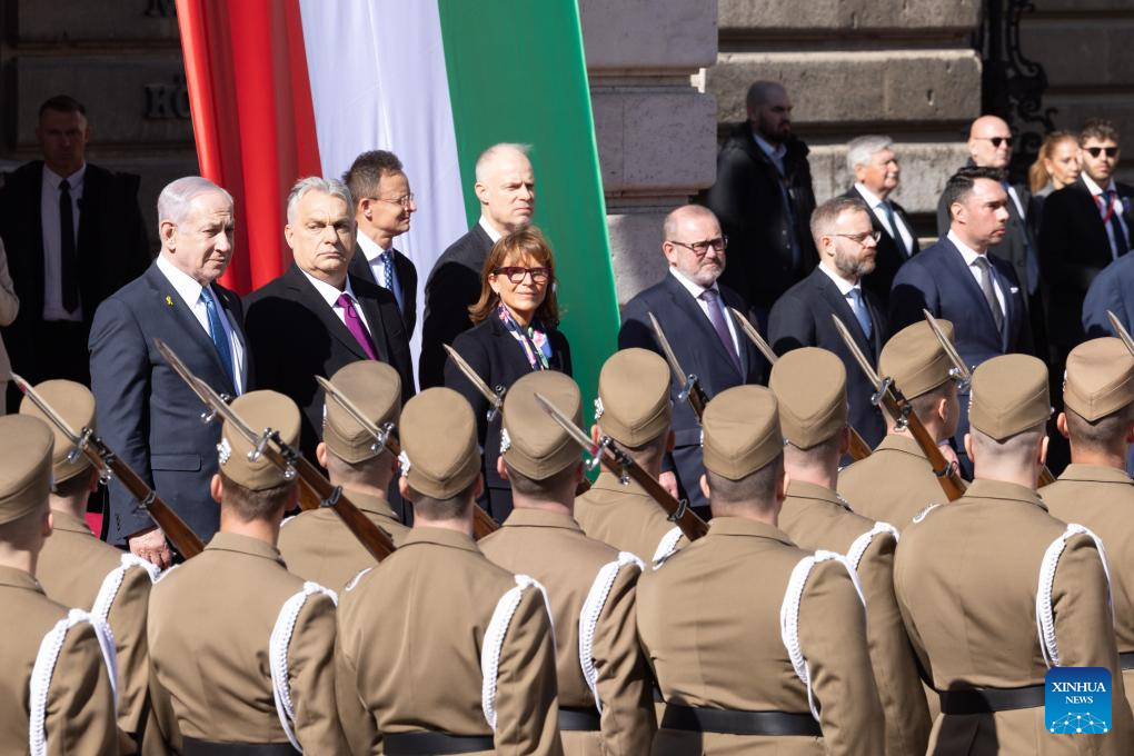 Hungarian Prime Minister Viktor Orban (R, front) holds a welcoming ceremony for his Israeli counterpart Benjamin Netanyahu in Budapest, Hungary on April 3, 2025. (Photo by Attila Volgyi/Xinhua)