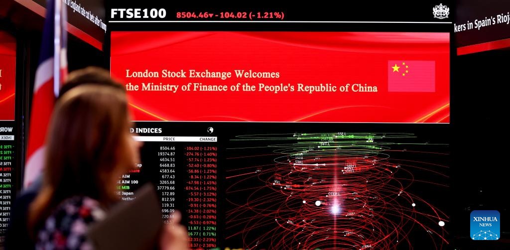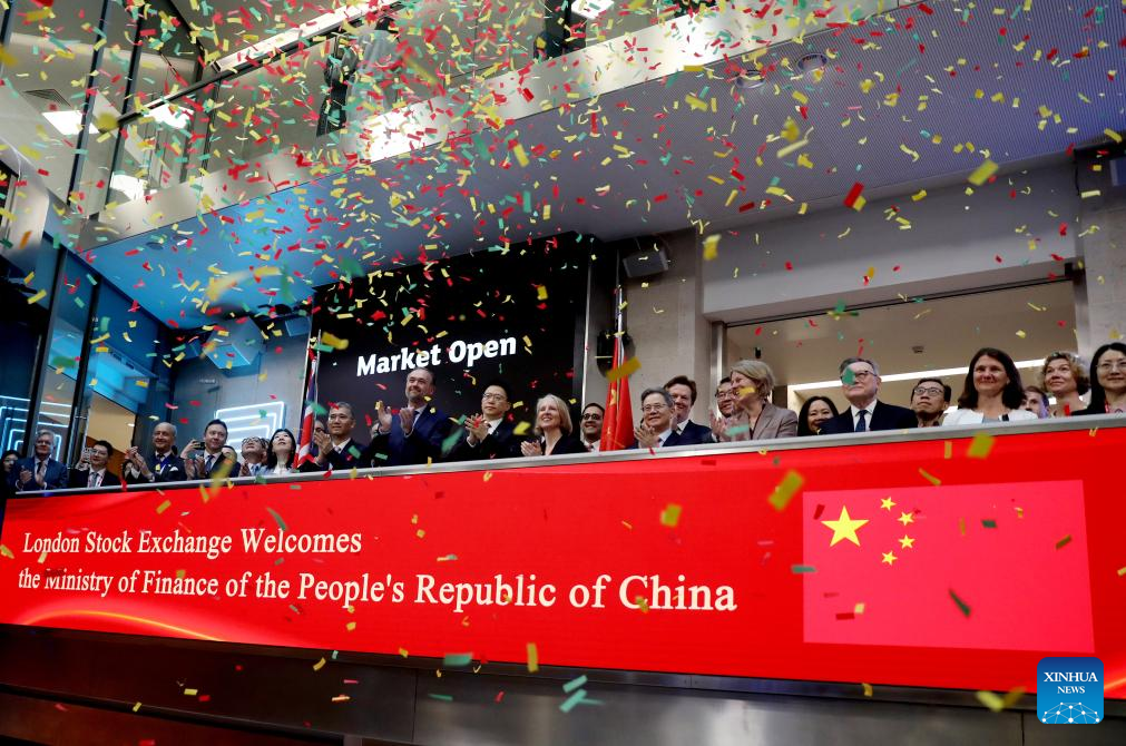 A ceremony is held at the London Stock Exchange to mark the issuance of China's first-ever overseas RMB-denominated sovereign green bond in London, Britain, April 3, 2025. China issued its first-ever overseas RMB-denominated sovereign green bond in London on April 2 London Time, China's Ministry of Finance said on Thursday.