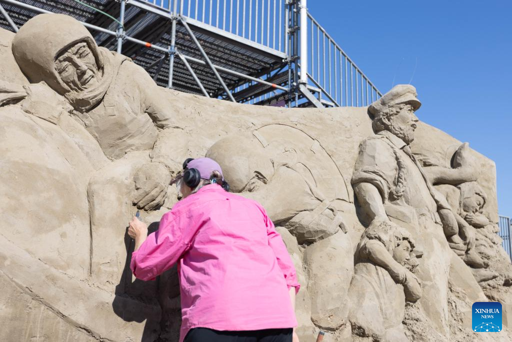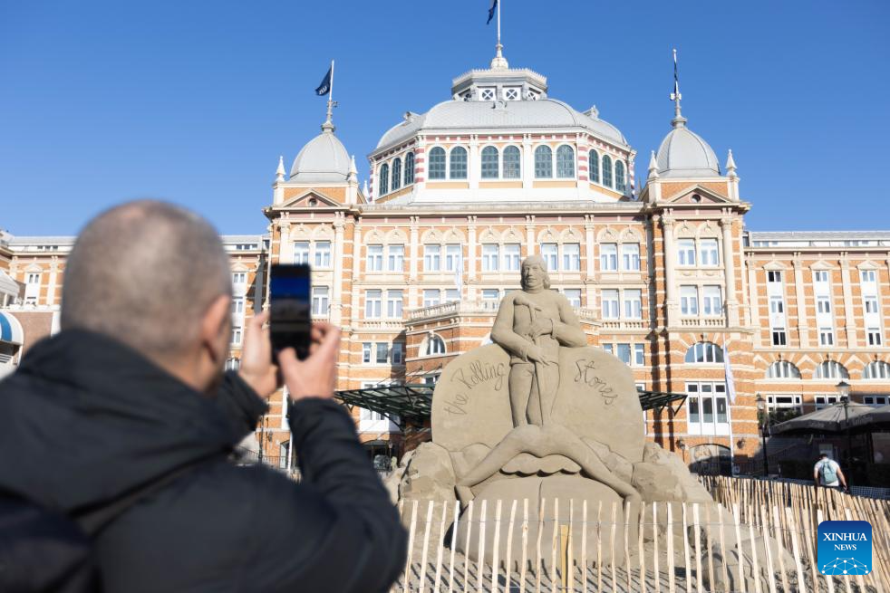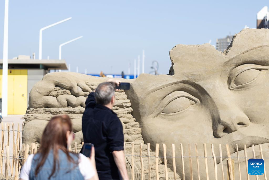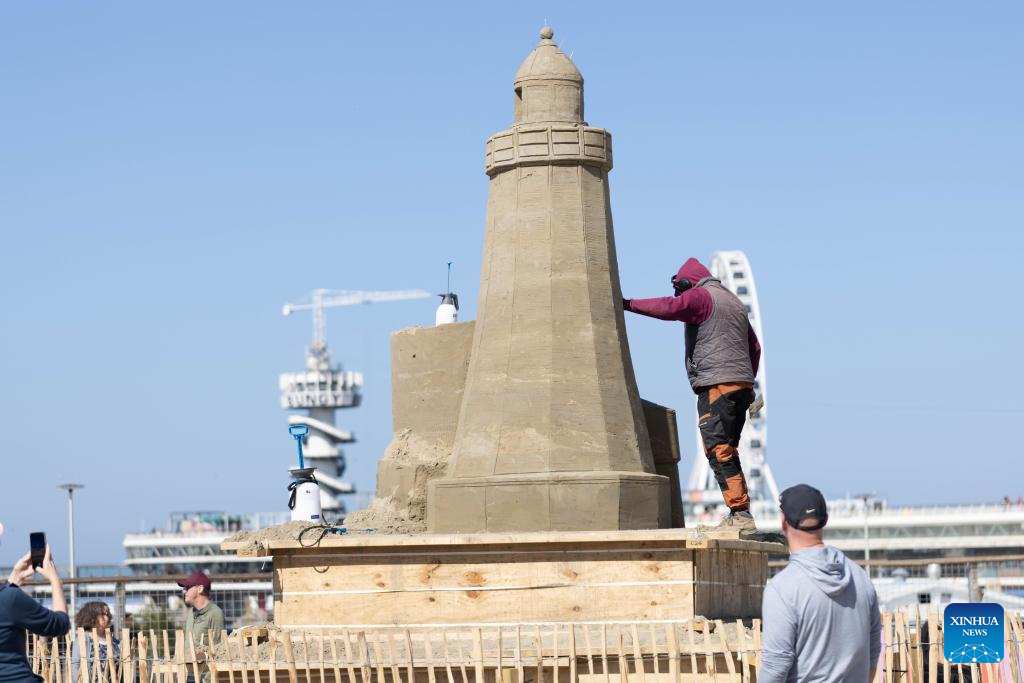 An artist works on a sand sculpture at Scheveningen beach in The Hague, the Netherlands, April 4, 2025. (Photo by Sylvia Lederer/Xinhua)
