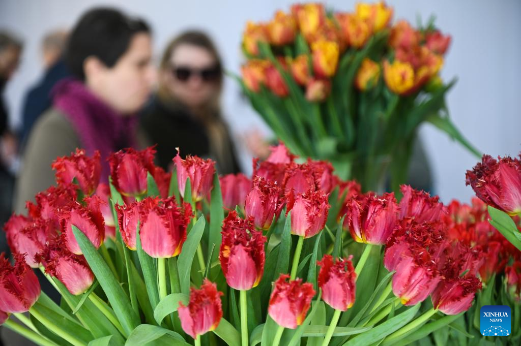 People visit the 15th Tulip Exhibition held at Wilanow Palace in Warsaw, Poland on April 5, 2025. The event runs through April 6. (Photo by Aleksy Witwicki/Xinhua)
