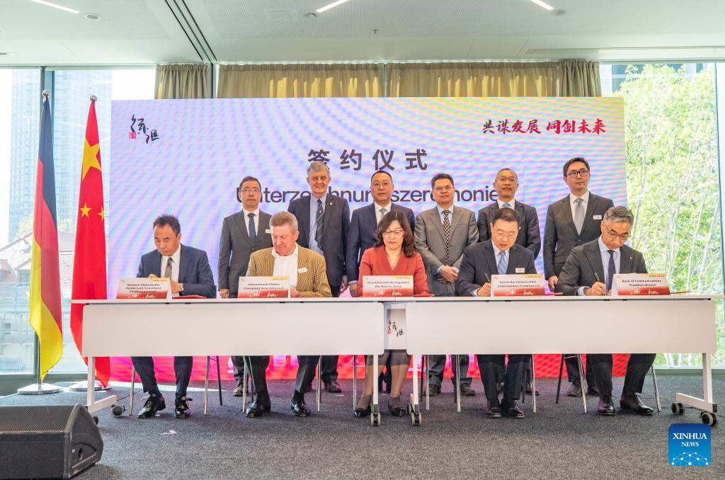 This photo taken on April 8, 2025 shows the memorandum of understanding (MoU) signing ceremony during an investment promotion conference in Frankfurt, Germany. Shanghai's Xuhui District held an investment promotion conference in Frankfurt on Tuesday, aiming to deepen Sino-German cooperation and attract more German businesses. (Xinhua/Zhang Fan)