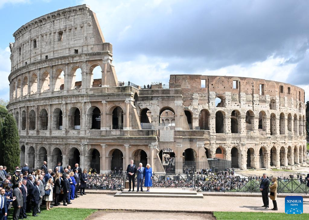 Britain's King Charles III and Queen Camilla stand in front of the Colosseum during a welcome ceremony in Rome, Italy, on April 8, 2025. (Photo by Alberto Lingria/Xinhua)