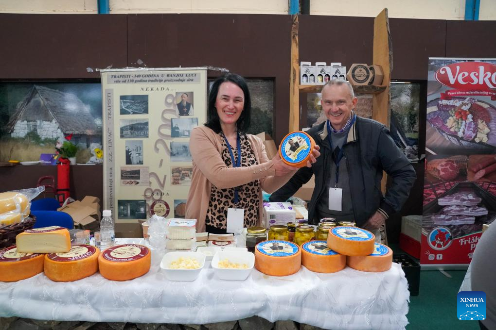 Exhibitors showcase specialty cheeses at a booth during the 26th International Economy Fair Mostar in Mostar, Bosnia and Herzegovina (BiH) on April 8, 2025. The event opened here Tuesday, in southern BiH, drawing around 800 exhibitors from over 30 countries. It is one of the major trade fairs in the Western Balkans.