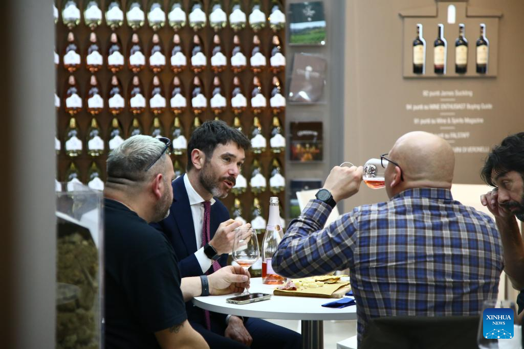 People taste wine at the international wine and spirits exhibition Vinitaly in Verona, Italy, April 9, 2025. (Xinhua)