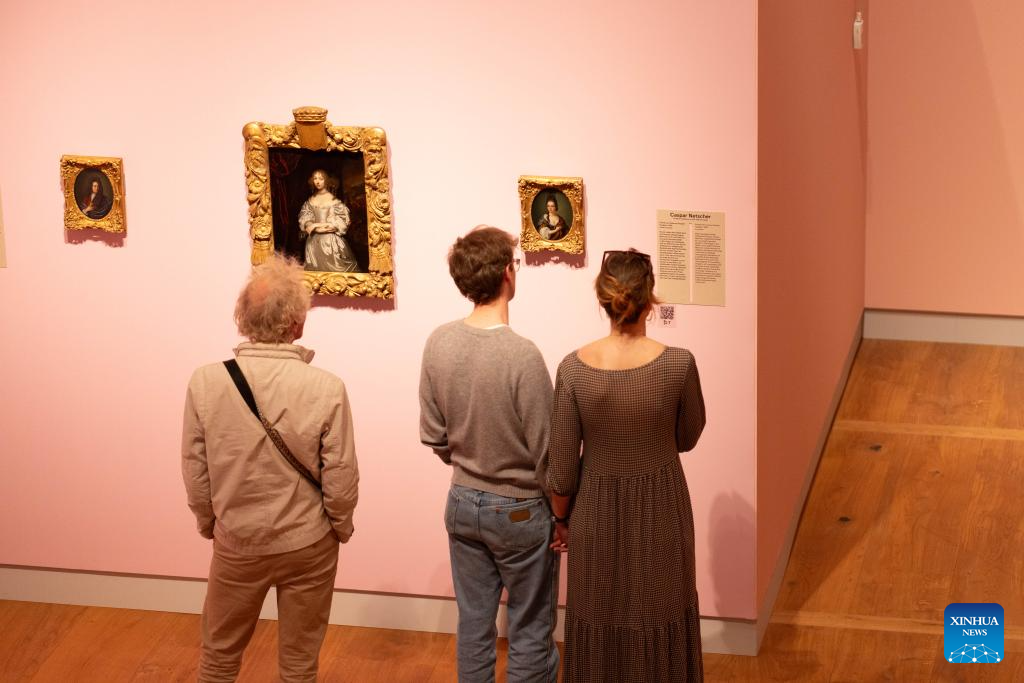 Visitors view artworks during the exhibition "From Rembrandt to Vermeer: Masterpieces from the Leiden Collection" in Amsterdam, the Netherlands, April 17, 2025. Featuring 75 works by 27 artists from the 17th-century Dutch Golden Age, including pieces by Rembrandt van Rijn and Johannes Vermeer, the exhibition runs from April 9 to August 24, 2025. (Photo by Sylvia Lederer/Xinhua)