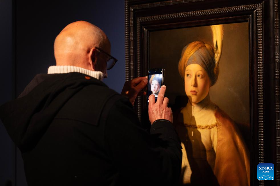 A visitor takes a photo of an artwork during the exhibition "From Rembrandt to Vermeer: Masterpieces from the Leiden Collection" in Amsterdam, the Netherlands, April 17, 2025. Featuring 75 works by 27 artists from the 17th-century Dutch Golden Age, including pieces by Rembrandt van Rijn and Johannes Vermeer, the exhibition runs from April 9 to August 24, 2025. (Photo by Sylvia Lederer/Xinhua)