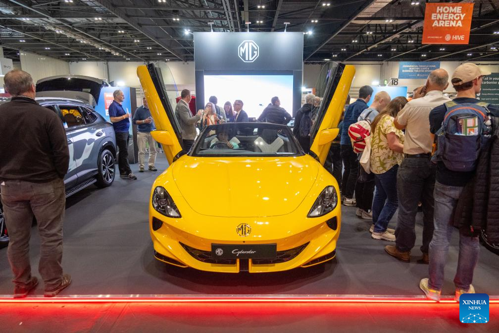 People visit the stand of Chinese car brand MG at Everything Electric London, a home energy and electric vehicle show, in London, Britain, on April 17, 2025. The three-day event kicked off on Wednesday in London's ExCeL exhibition center. (Photo by Ray Tang/Xinhua)