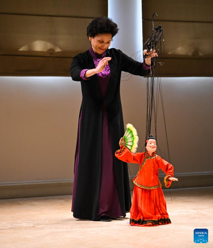 A Chinese artist performs Quanzhou string puppetry of southeast China's Fujian Province during the International Chinese Language Day celebration at Bogazici University in Istanbul, Türkiye, April 18, 2025. (Xinhua/Liu Lei)