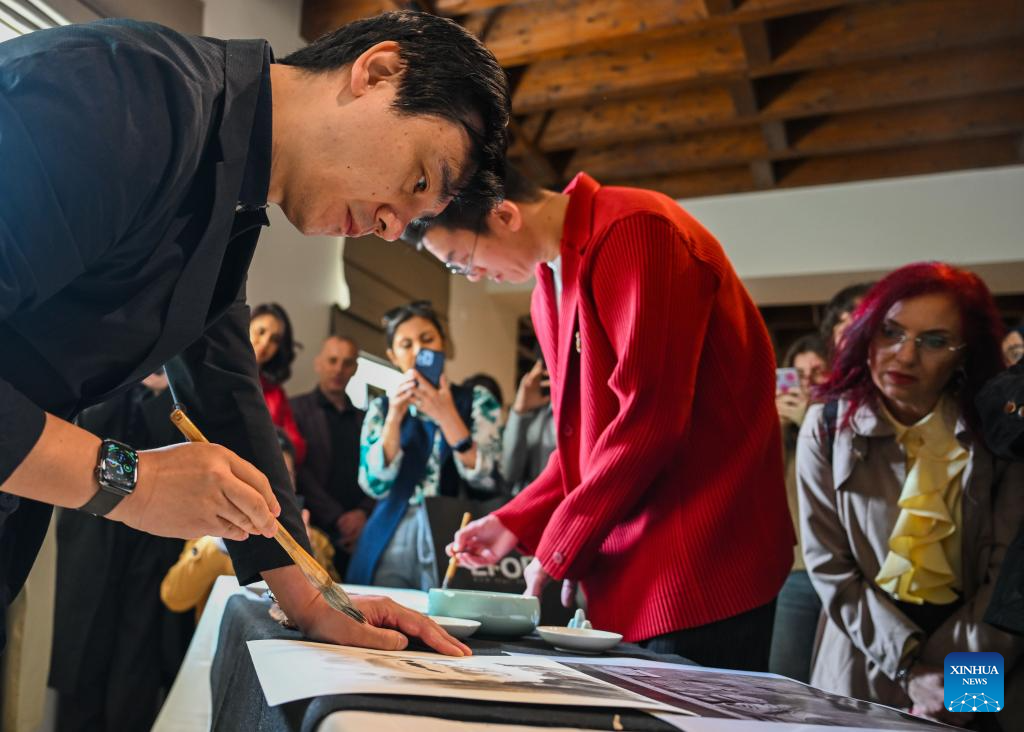 Chinese artists demonstrate Chinese painting art during the International Chinese Language Day celebration at Bogazici University in Istanbul, Türkiye, April 18, 2025. (Xinhua/Liu Lei)
