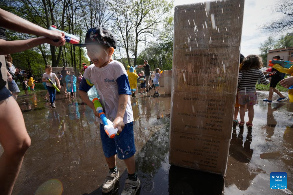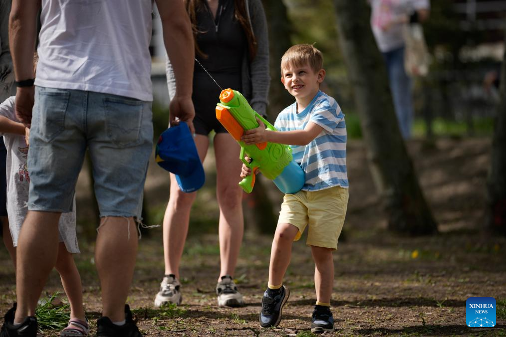 Children play with toy water guns during Smigus-Dyngus, or Wet Monday, a Polish Easter tradition, in Lodz, Poland on April 21, 2025. The centuries-old custom, celebrated on the second day of Easter, involves playful water fights to mark the arrival of spring. (Photo by Jaap Arriens/Xinhua)