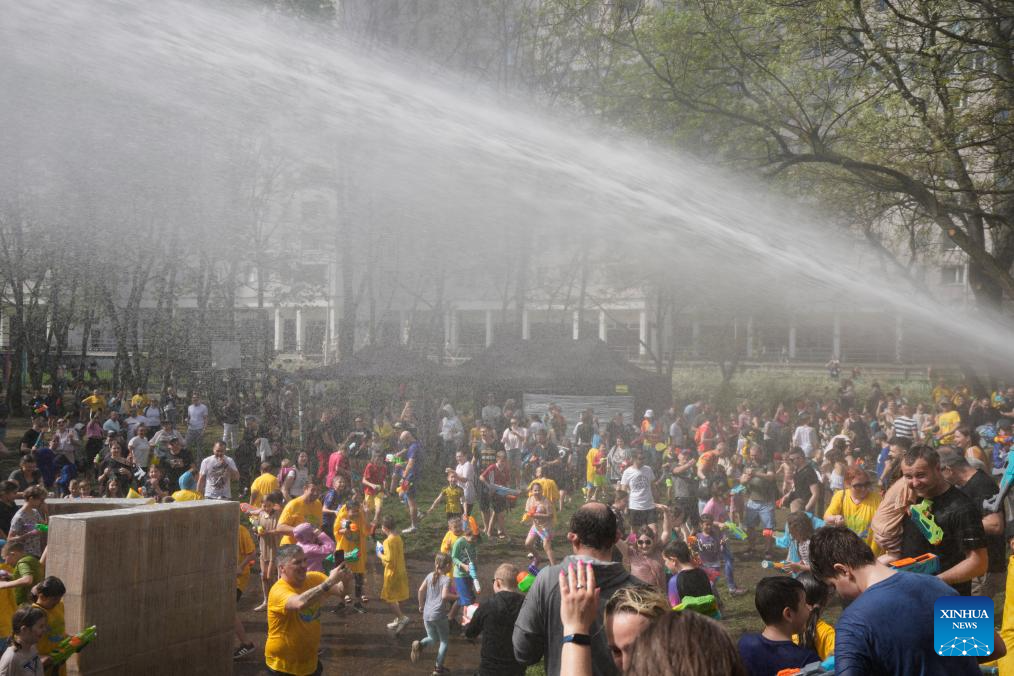 People enjoy water fights during Smigus-Dyngus, or Wet Monday, a Polish Easter tradition, in Lodz, Poland, April 21, 2025. The centuries-old custom, celebrated on the second day of Easter, involves playful water fights to mark the arrival of spring. (Photo by Jaap Arriens/Xinhua)