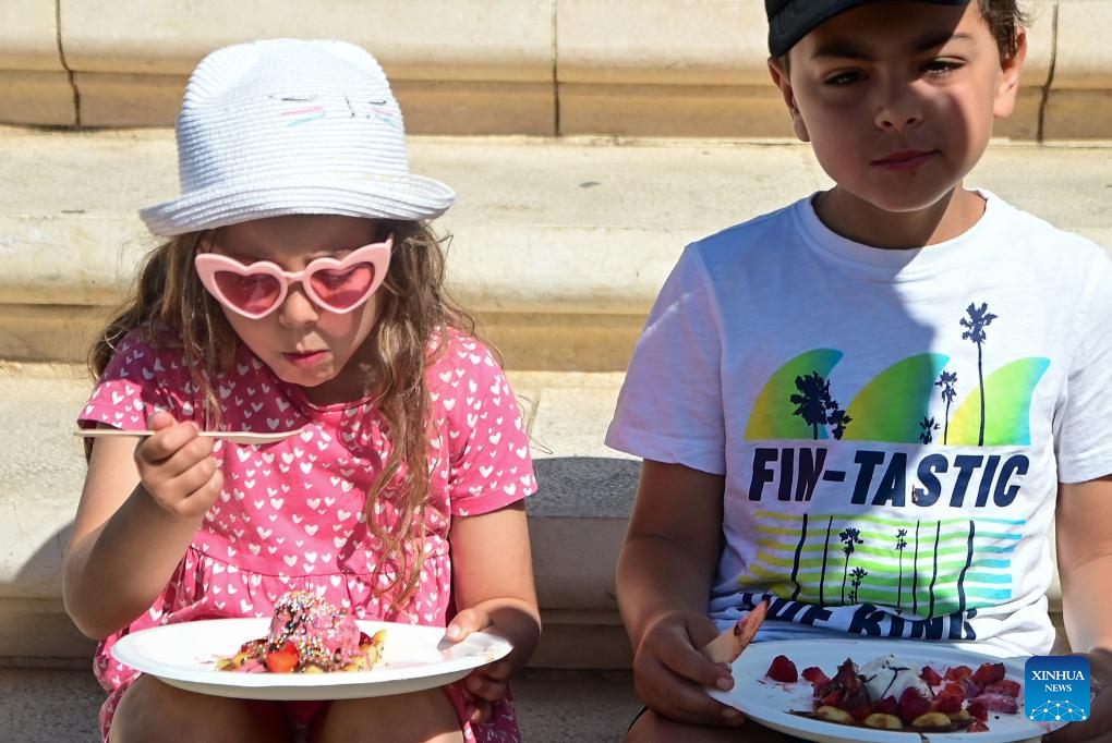 Children eat desserts made with strawberries during the strawberry festival in Mgarr, Malta, April 27, 2025. Malta held its annual strawberry festival in Mgarr, a picturesque agricultural village in north Malta on Sunday. (Photo by Jonathan Borg/Xinhua)