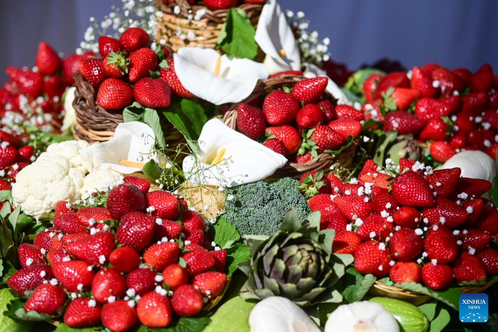 This photo taken on April 27, 2025 shows decorations with strawberries during the strawberry festival in Mgarr, Malta. Malta held its annual strawberry festival in Mgarr, a picturesque agricultural village in north Malta on Sunday. (Photo by Jonathan Borg/Xinhua)