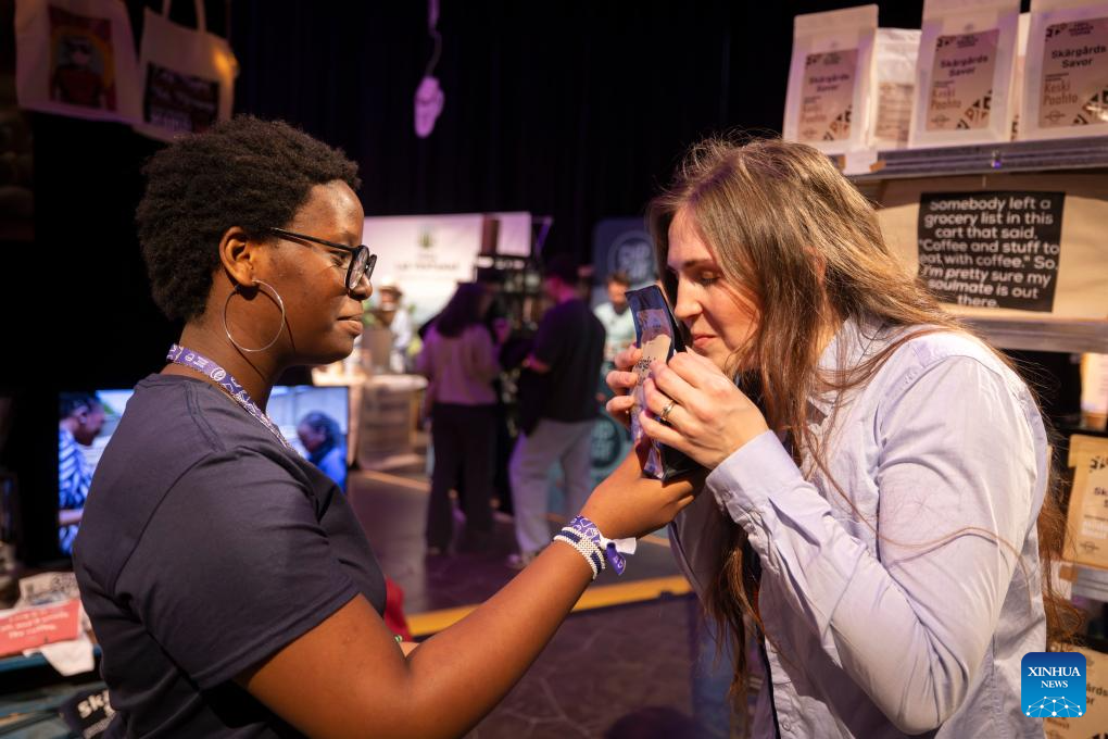 A woman smells coffee beans during the 2025 Helsinki Coffee Festival in Helsinki, Finland, April 26, 2025. The 2025 Helsinki Coffee Festival is held here from April 25 to 27, featuring about 60 exhibitors showcasing their coffee products, tea beverages, coffee appliances and a variety of products. (Photo by Matti Matikainen/Xinhua)