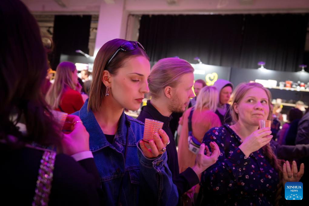 People taste coffee during the 2025 Helsinki Coffee Festival in Helsinki, Finland, April 26, 2025. The 2025 Helsinki Coffee Festival is held here from April 25 to 27, featuring about 60 exhibitors showcasing their coffee products, tea beverages, coffee appliances and a variety of products. (Photo by Matti Matikainen/Xinhua)