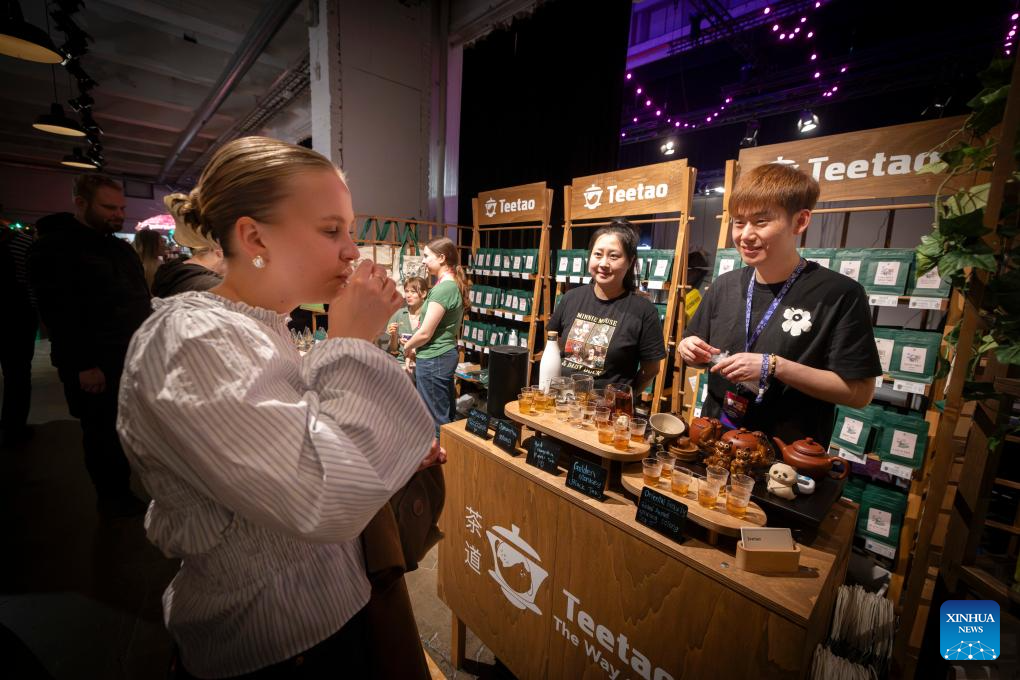 A woman tastes tea beverages displayed by a Chinese exhibitor during the 2025 Helsinki Coffee Festival in Helsinki, Finland, April 26, 2025. The 2025 Helsinki Coffee Festival is held here from April 25 to 27, featuring about 60 exhibitors showcasing their coffee products, tea beverages, coffee appliances and a variety of products. (Photo by Matti Matikainen/Xinhua)