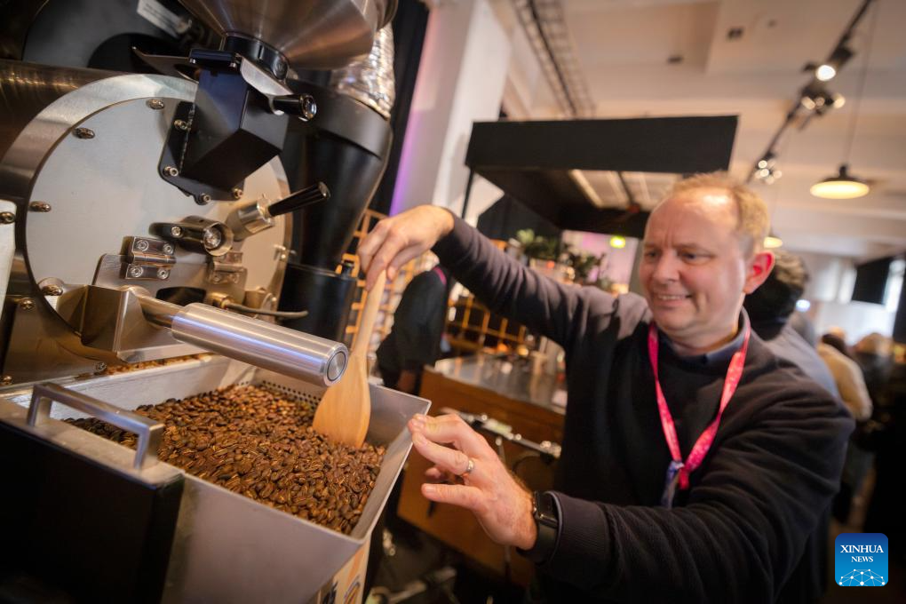 An exhibitor roasts coffee beans during the 2025 Helsinki Coffee Festival in Helsinki, Finland, April 26, 2025. The 2025 Helsinki Coffee Festival is held here from April 25 to 27, featuring about 60 exhibitors showcasing their coffee products, tea beverages, coffee appliances and a variety of products. (Photo by Matti Matikainen/Xinhua)