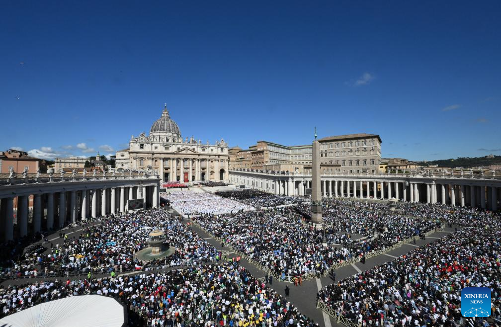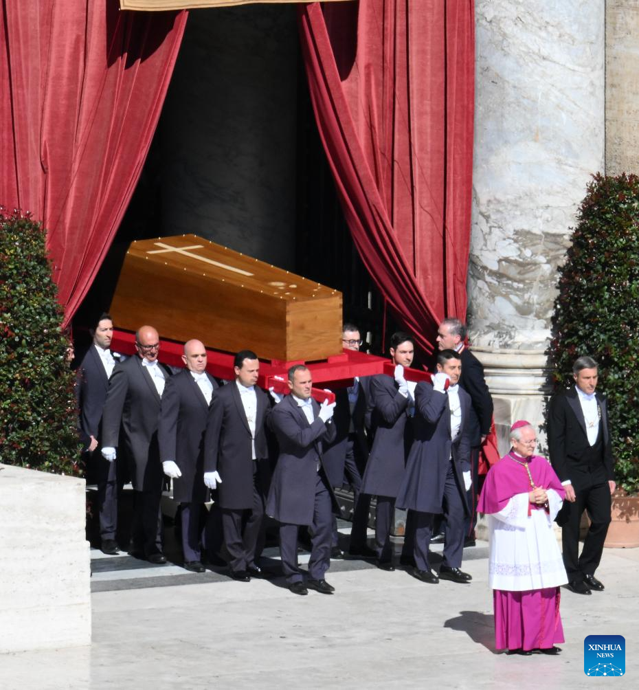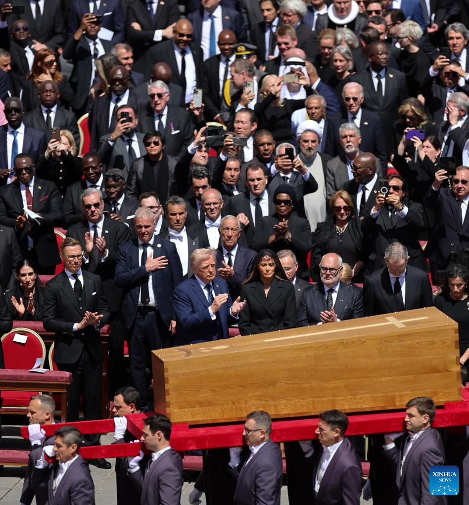 This photo taken on April 26, 2025 shows a scene during Pope Francis's funeral at St. Peter's Square in Vatican. Pope Francis, the 266th pontiff of the Roman Catholic Church, died Monday at the age of 88. (Xinhua/Li Jing)