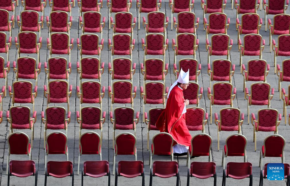 A member of the clergy attends Pope Francis's funeral at St. Peter's Square in Vatican on April 26, 2025. Pope Francis, the 266th pontiff of the Roman Catholic Church, died Monday at the age of 88. (Xinhua/Li Jing)