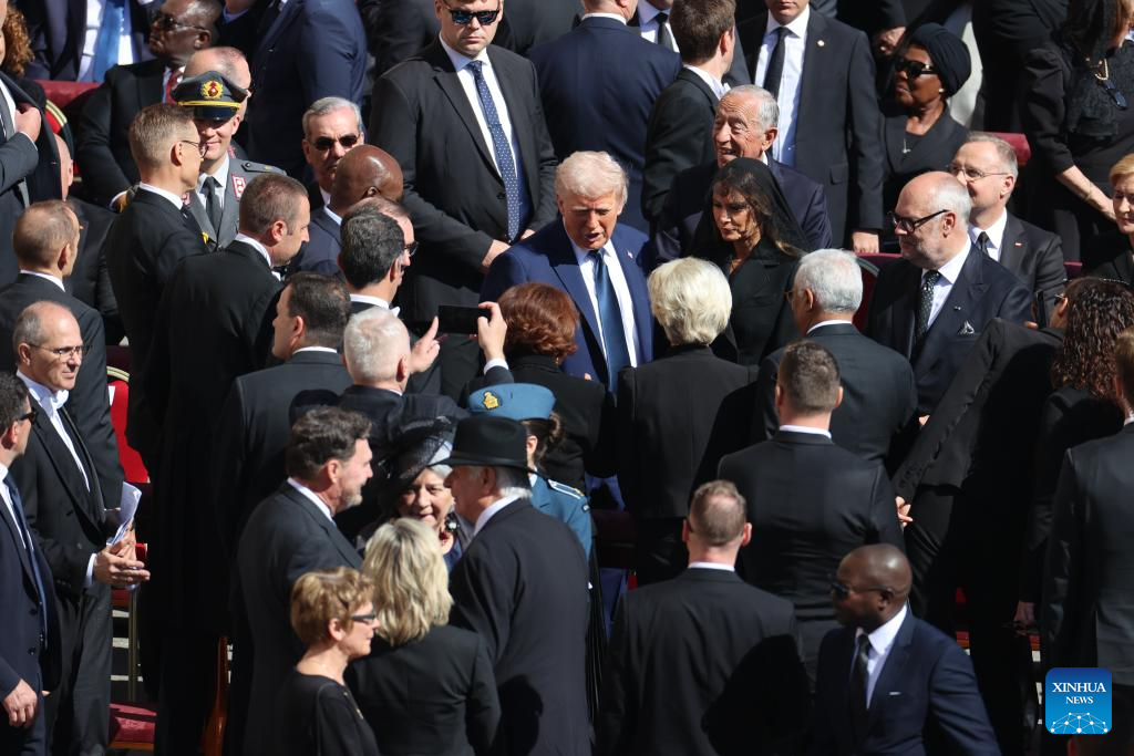 U.S. President Donald Trump (C) arrives for Pope Francis's funeral at St. Peter's Square in Vatican on April 26, 2025. Pope Francis, the 266th pontiff of the Roman Catholic Church, died Monday at the age of 88. (Xinhua/Li Jing)
