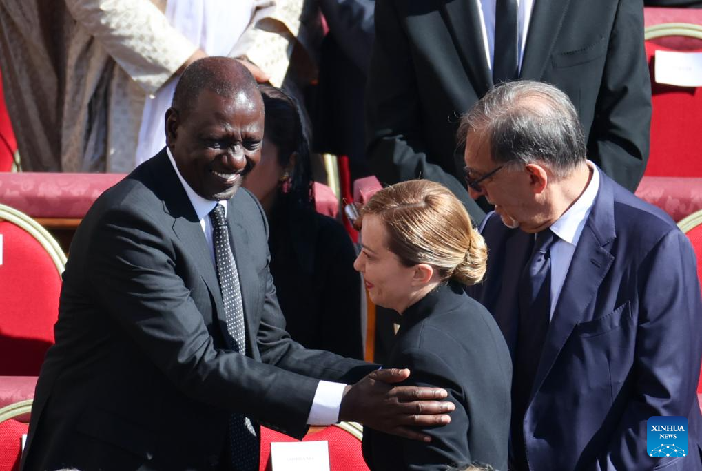 Kenyan President William Ruto (L) talks with Italian Prime Minister Giorgia Meloni at Pope Francis's funeral at St. Peter's Square in Vatican on April 26, 2025. Pope Francis, the 266th pontiff of the Roman Catholic Church, died Monday at the age of 88. (Xinhua/Li Jing)