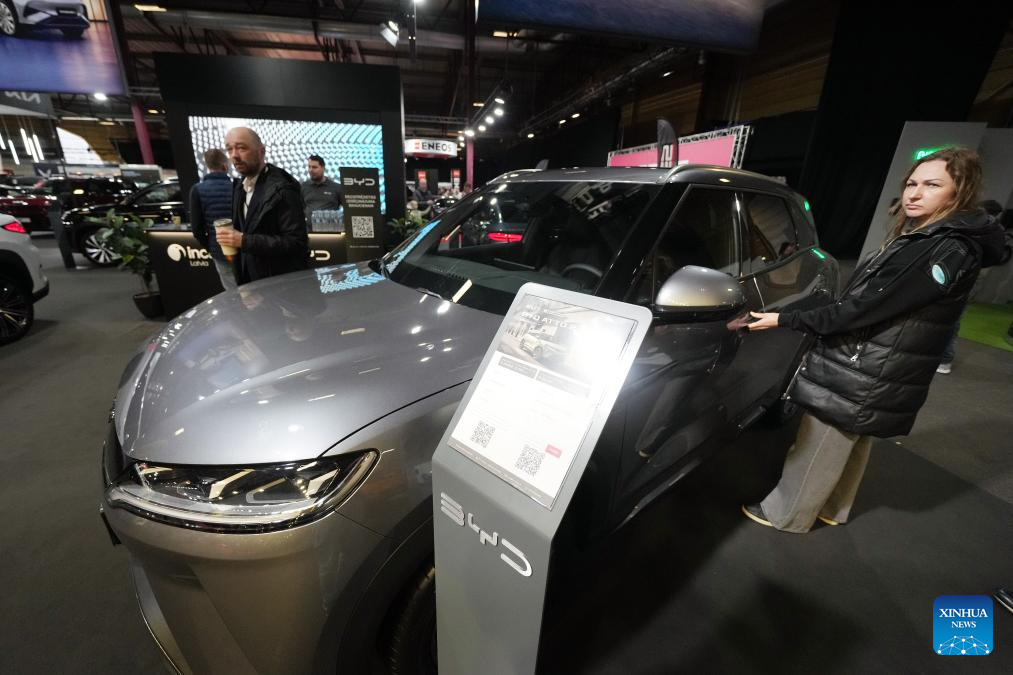 This photo taken on April 27, 2025 shows the booth of Chinese electric vehicle manufacturer BYD during the Baltic Motor Show Riga "Auto 2025" in Riga, Latvia. (Photo by Edijs Palens/Xinhua)