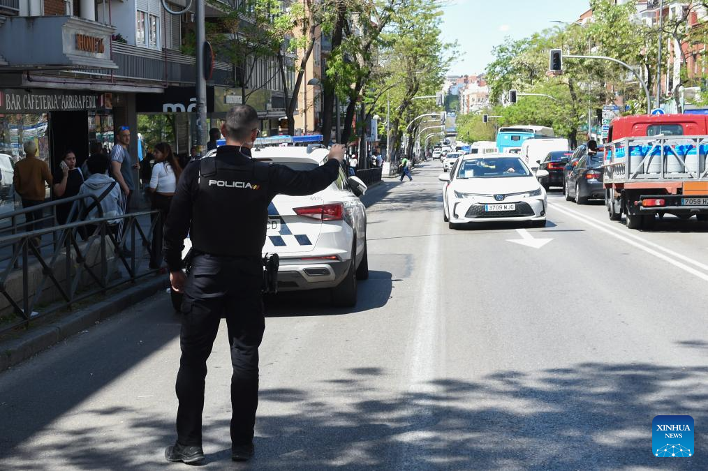 (250429) -- MADRID, April 29, 2025 (Xinhua) -- A police officer directs traffic during a power outage in Madrid, Spain, April 28, 2025.