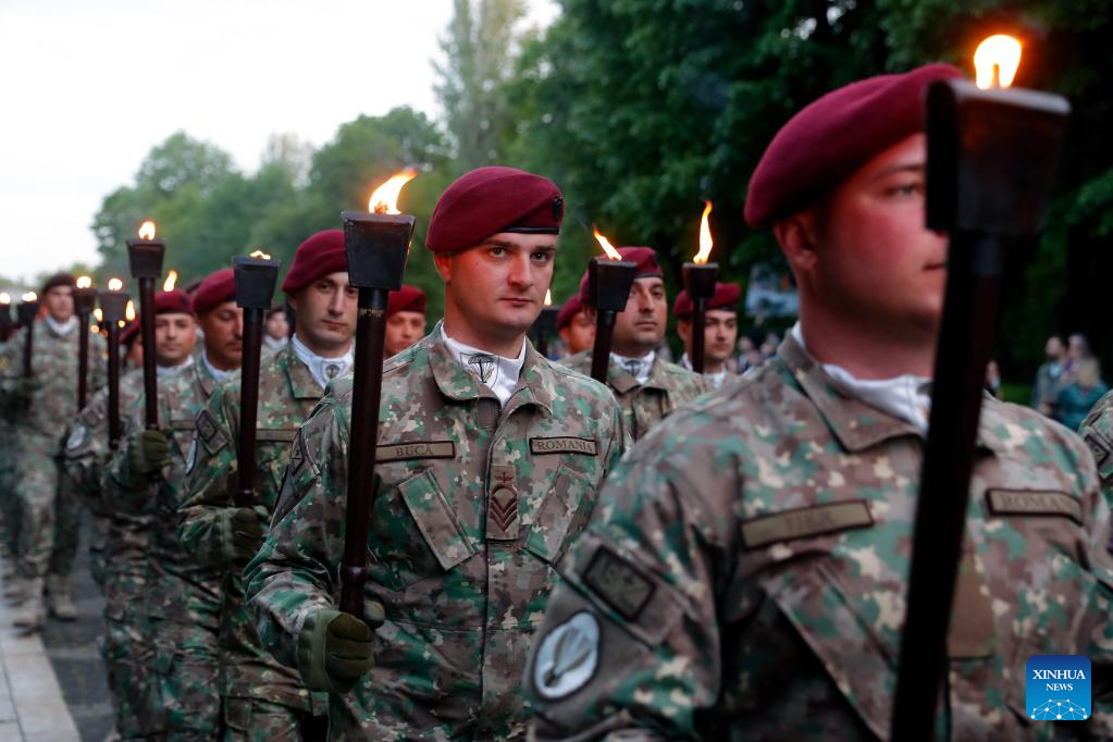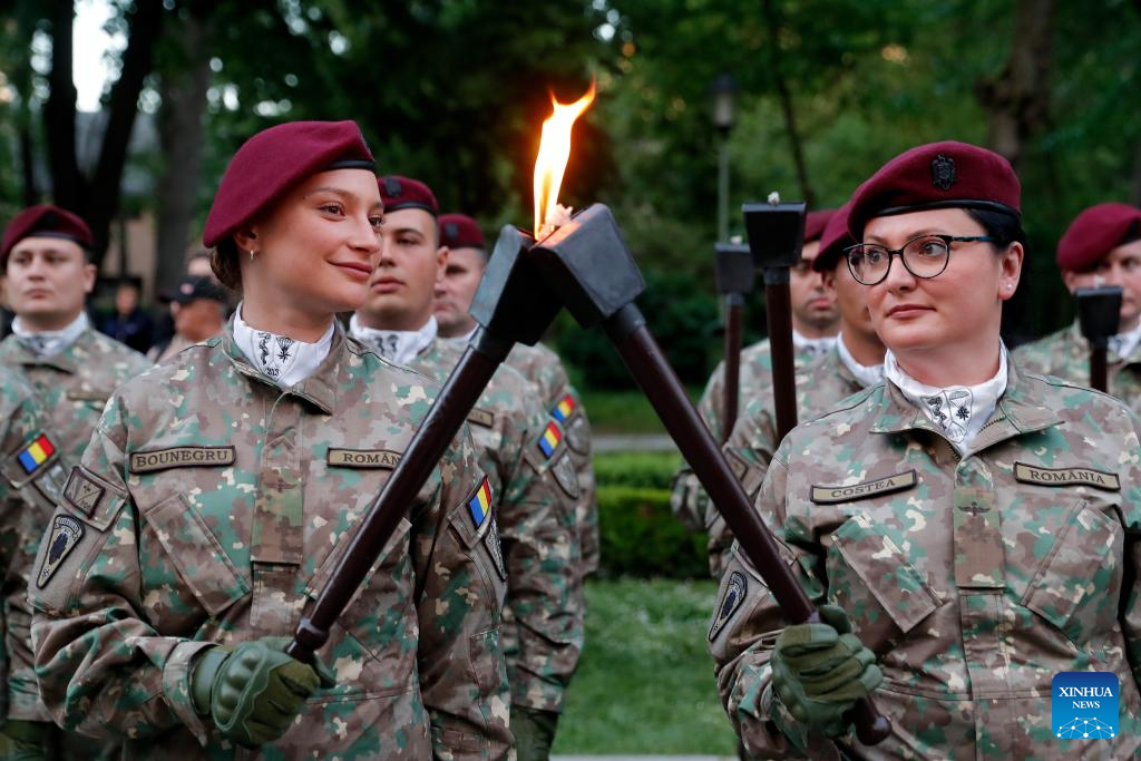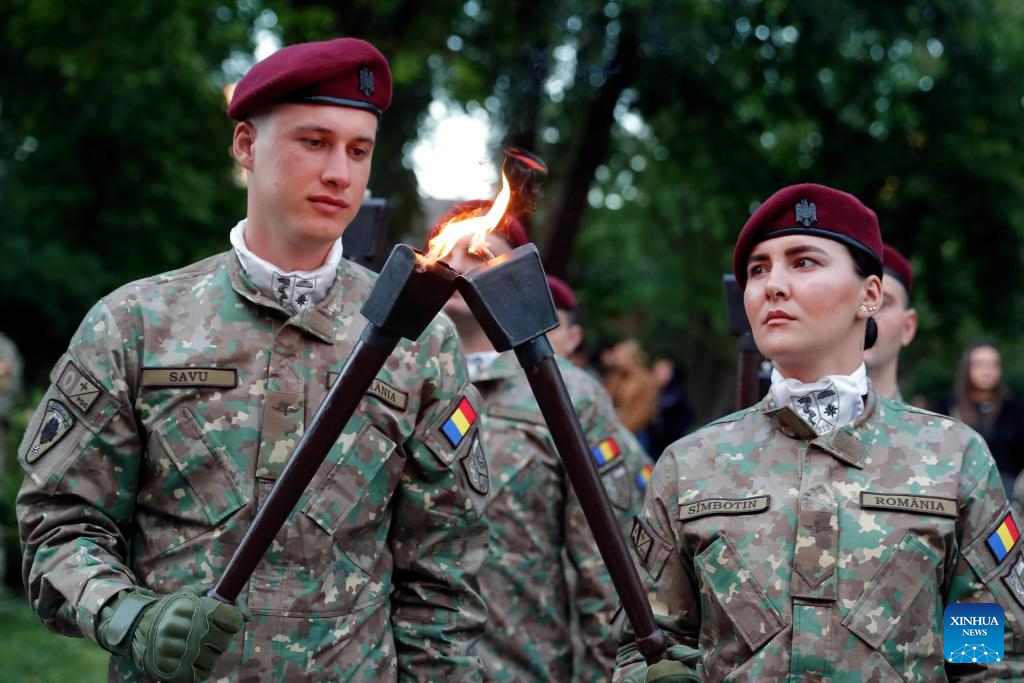 Soldiers light torches before a march to commemorate the Romanian Land Forces Day in Bucharest, Romania, April 27, 2025. (Photo by Cristian Cristel/Xinhua)