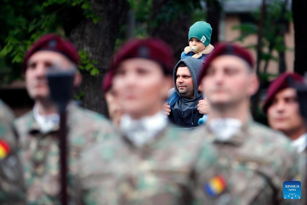 A child gazes at soldiers before a march to commemorate the Romanian Land Forces Day in Bucharest, Romania, April 27, 2025. (Photo by Cristian Cristel/Xinhua)
