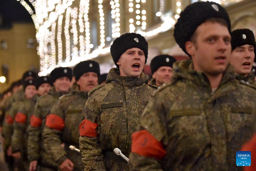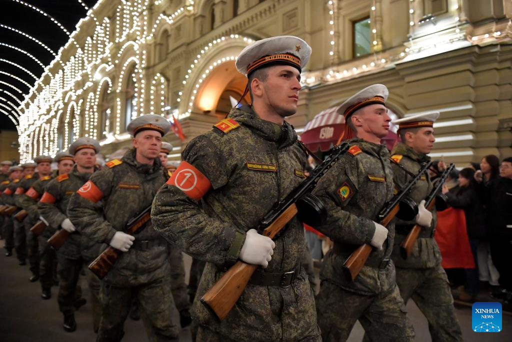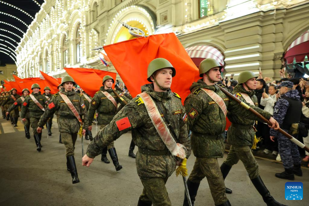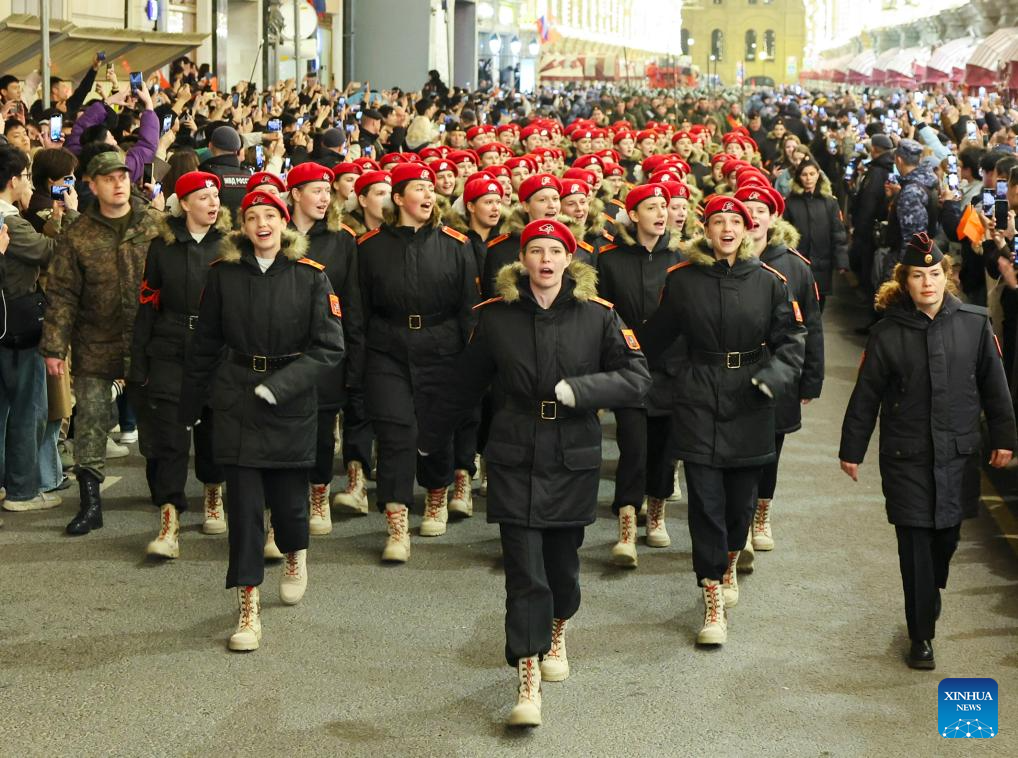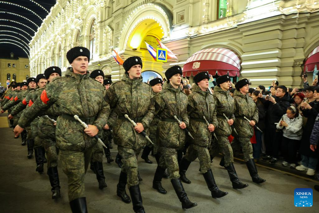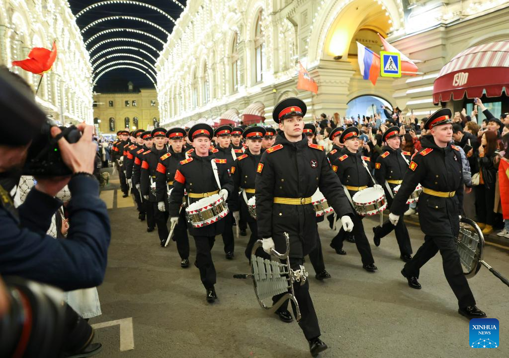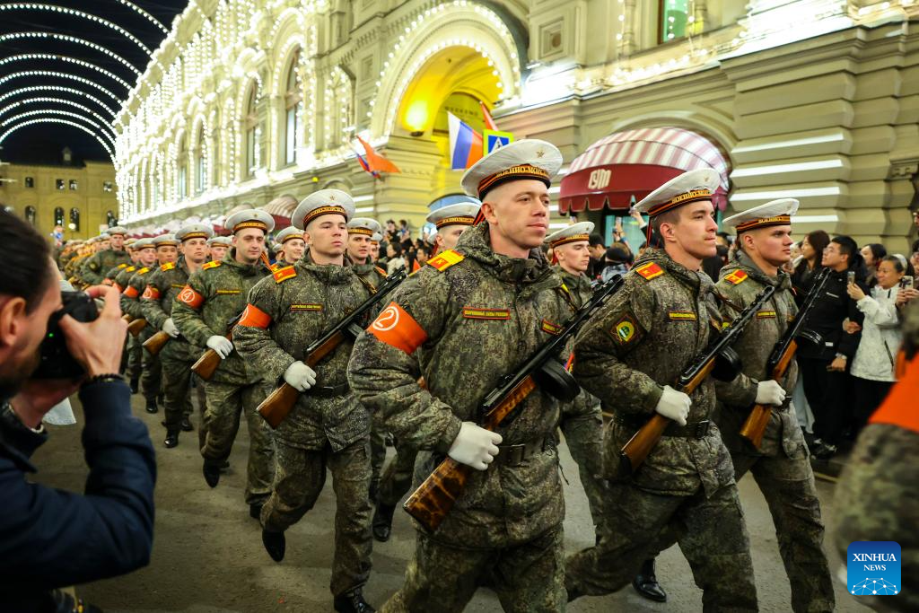 Servicemen are pictured on their way to the Red Square to attend a rehearsal for the Victory Day military parade, which marks the 80th anniversary of the Soviet victory in the Great Patriotic War, Russia's term for World War II, in Moscow, Russia, May 3, 2025. (Xinhua/Yao Dawei)