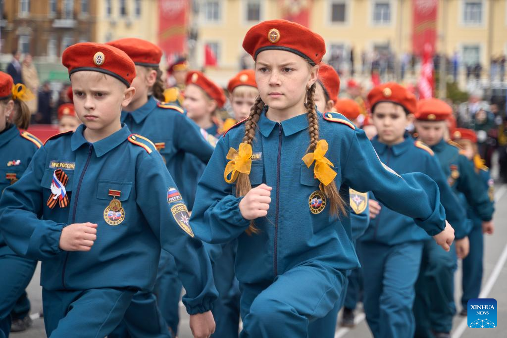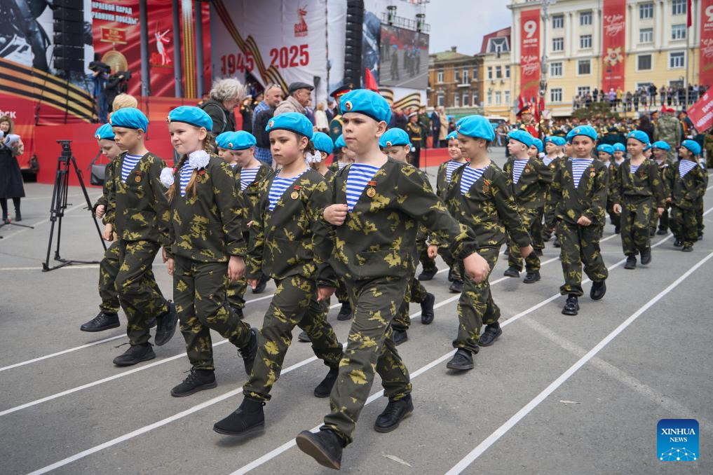A formation of primary school students takes part in a "Great-grandchildren of Victory" parade to celebrate the 80th anniversary of the Victory in the Great Patriotic War in Vladivostok, Russia, May 4, 2025. (Photo by Guo Feizhou/Xinhua)