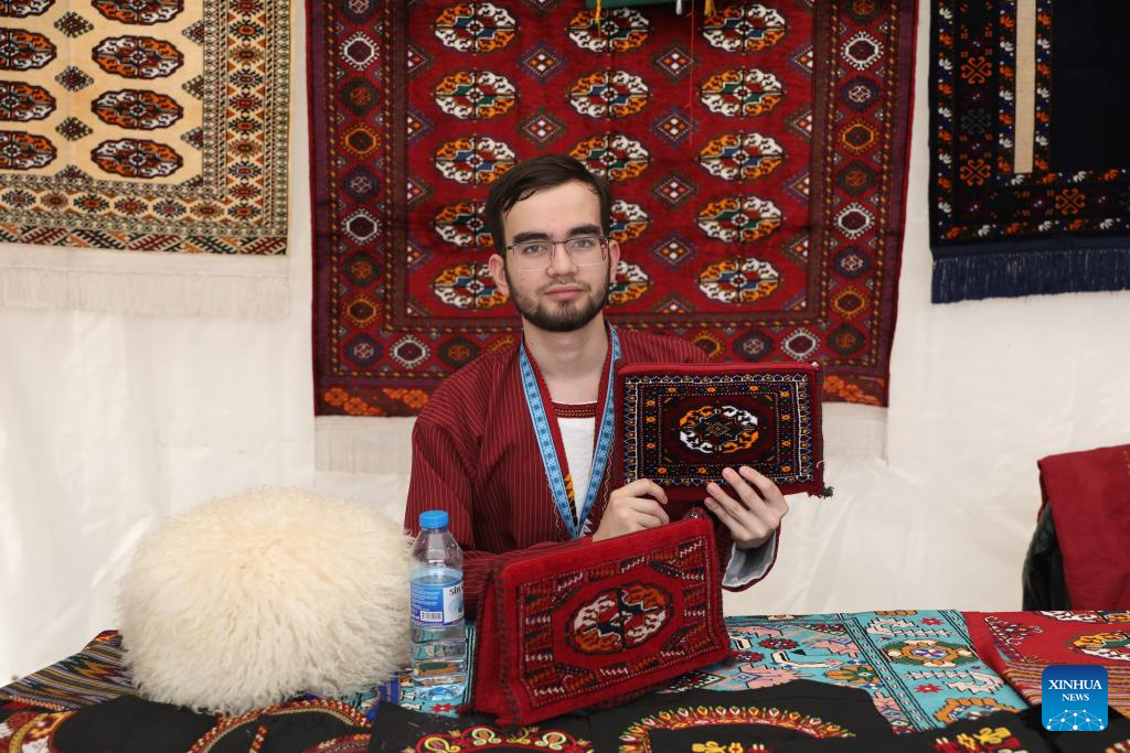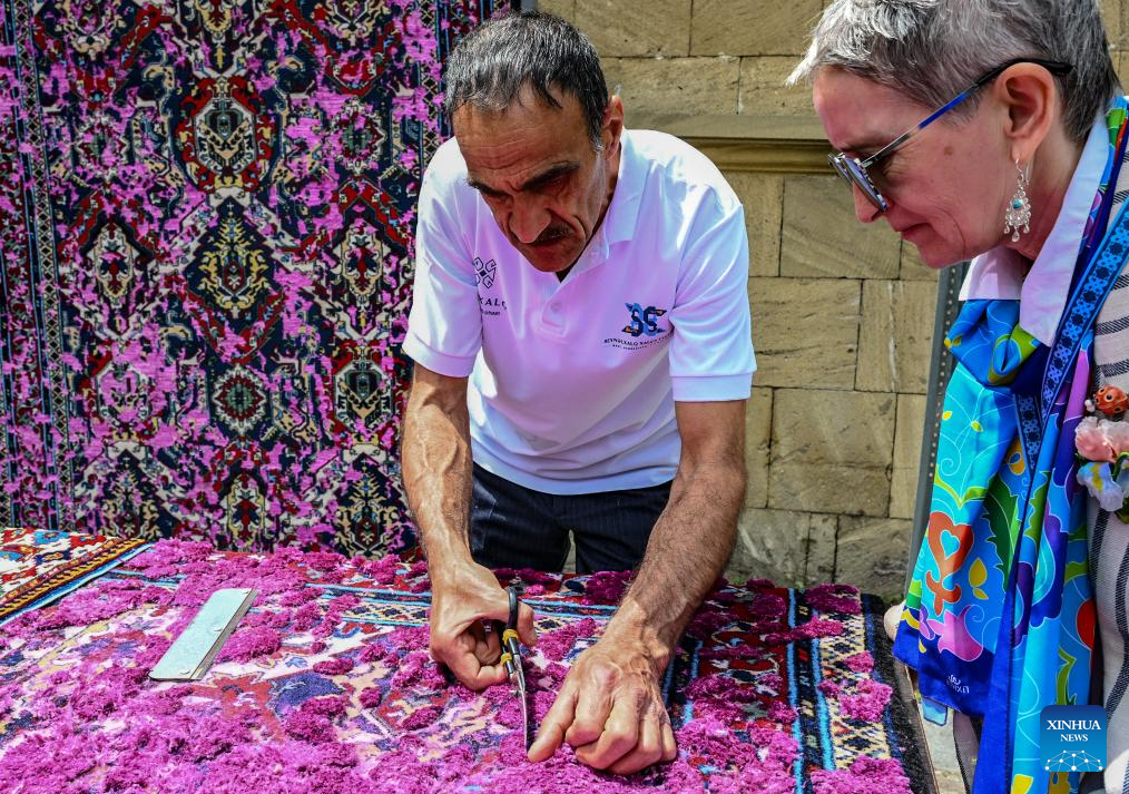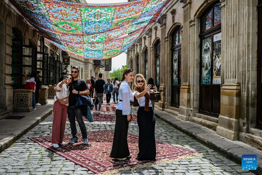 Visitors take selfies at the International Carpet Festival held in Baku, Azerbaijan, on May 3, 2025. (Photo by Tofik Babayev/Xinhua)